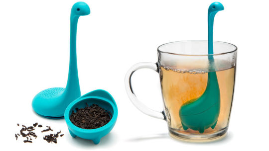A dinosaur-shaped (Nessie/Loch Ness monster) silicone tea infuser that opens to hold loose-leaf tea, combining whimsy with functional tea brewing.