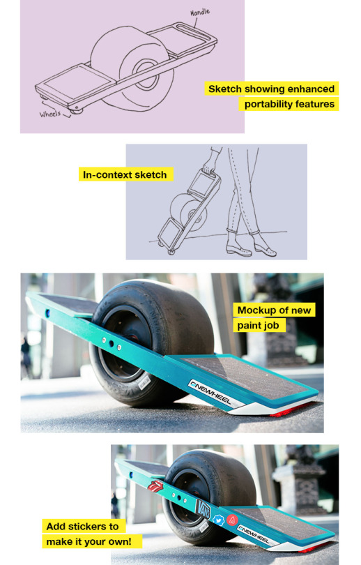 Redesigned Onewheel experience targeting women in tech companies, with gender-neutral corporate channel strategy, built-in handle and pop-out wheels for portability, and a friendlier visual design.