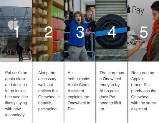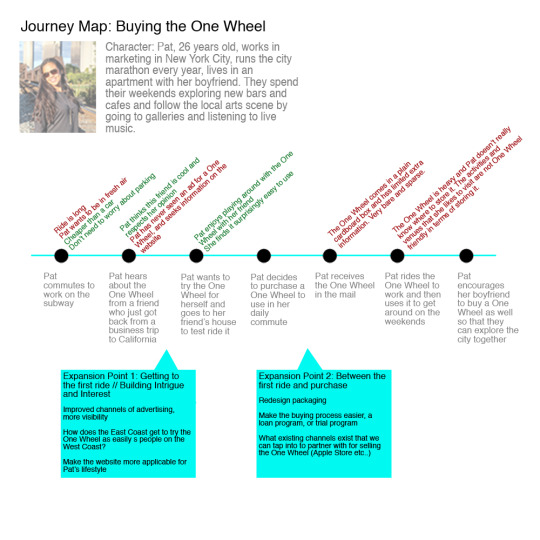 Our original journey map explores the current way that a potential consumer, in this case, Pat, might interact with the One Wheel.