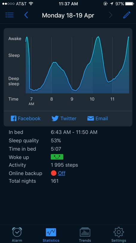 I like the app because even though it is clunky and takes a while to learn to get right, it works. And it works really well – I can easily get away with 5 hours of sleep and still feel great the next day. Even though some nights I do forget to use it, I’ve used it a 161 times since downloading it onto my phone last year. Every morning after I wake up I get to see this, my sleep graph: