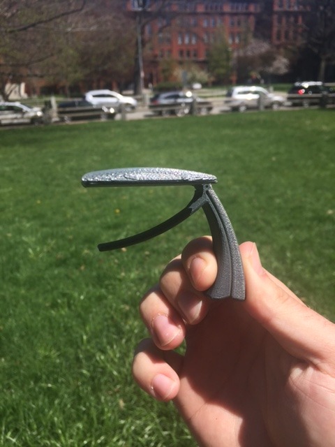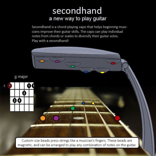 My submission is in the form of a presentation (link below), which gives background info on how guitars work, what a ‘capo’ is, and how I am redesigning it. It also outlines the important details of inspiration, development, and aftermath.