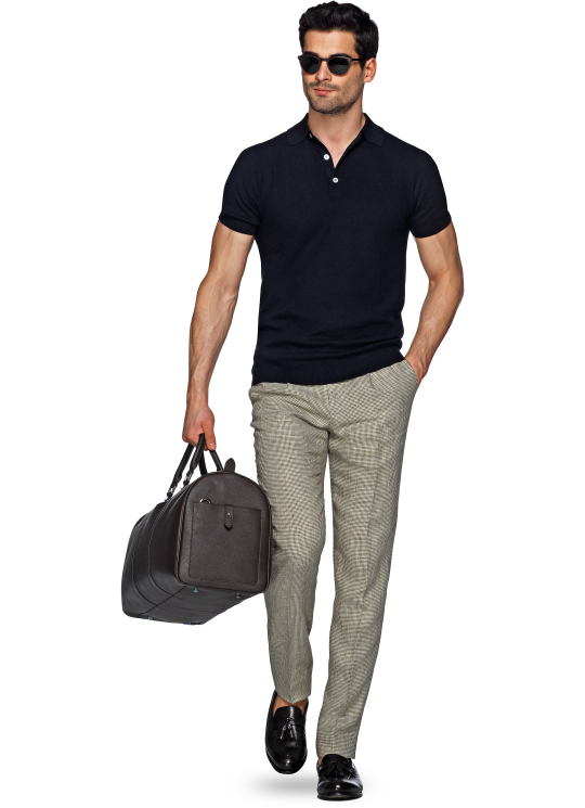 A Suit Supply navy polo shirt with elastane ribbing that creates a permanently tucked-in appearance, chosen after systematic comparison across multiple brands.