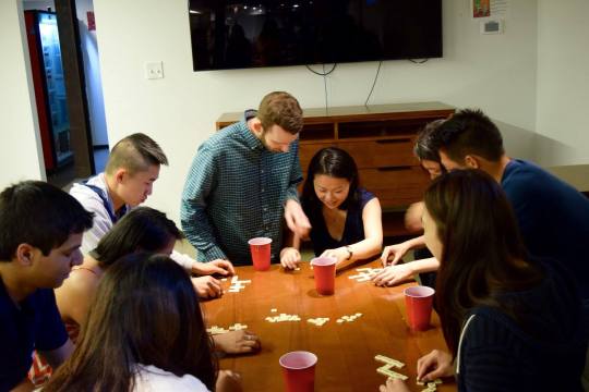 A few days ago, I played Bananagrams with friends (pictured below – the back of my head is in the bottom left corner). I was struck by the simplicity and fun of the game. Essentially, the end goal is to use all of your letters to form Scrabble-type word formations before everyone else. Each player begins with 12 letters, but adds more and more to their collection each time someone has finished using all of their letters.