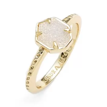 A Kendra Scott gold ring with a druzy stone setting, received as a birthday gift and worn frequently as a timeless jewelry piece.