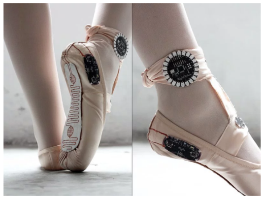 E-Traces, sensor-embedded ballet pointe shoes that generate digital drawings from a dancer's foot movements, merging technology with dance art.