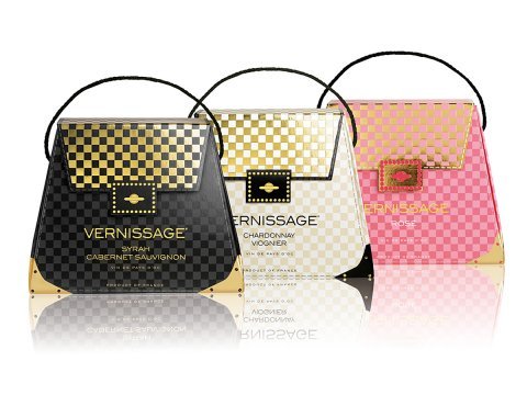 Vernissage boxed wine redesigned as fashionable handbag-shaped packaging, elevating the boxed wine category with elegant checkerboard patterns matched to wine varietals.