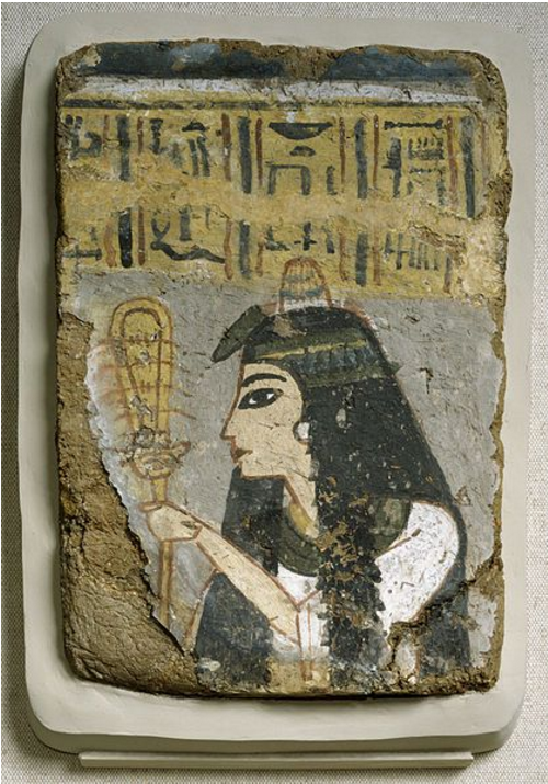 Artifact showing ancient Egyptian woman with kohl rimmed eyes.
