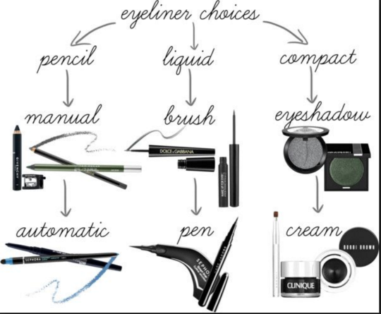 different forms of eyeliners: powder, wax, gel, liquid, and kohl. Their