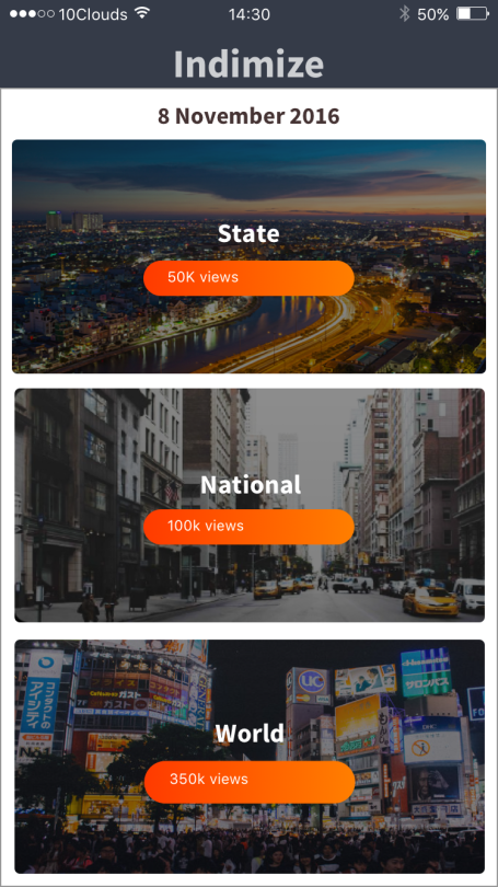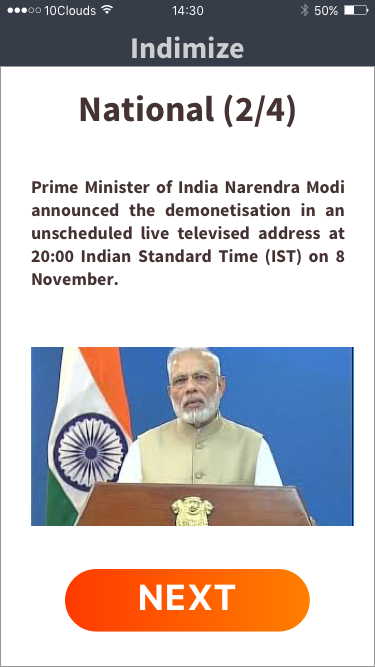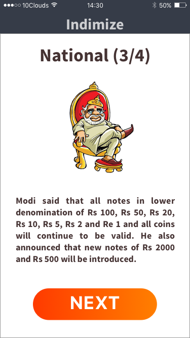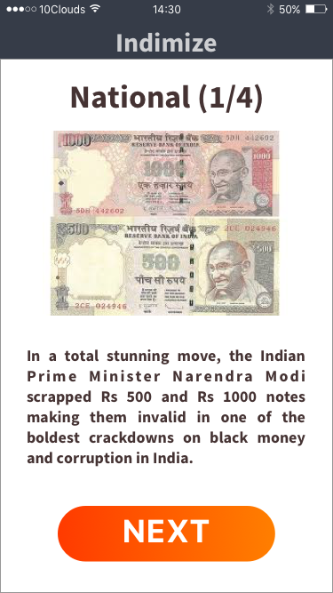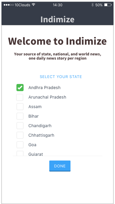 Indimize provides its readers with one brief news story a day in each of three categories: state news, national news, and world news. It provides value to its readers by being the first news app they check every day, minimizing decision fatigue through careful curation. Since users only have one story per region, Indimize builds itself into two minutes of every Indians’ morning routine.