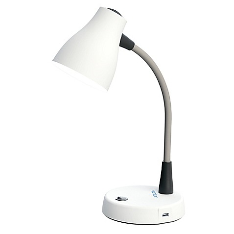 Verilux Natural Spectrum Desk Lamp, a function-first college desk lamp with flexible neck, USB/AC outlets in the base, and diffused natural spectrum lighting.