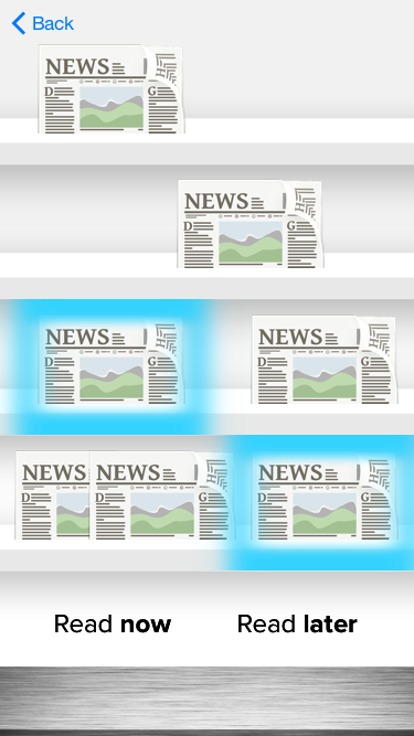 Screen 2: Because this user was more comfortable reading news in print form, when possible, the app includes familiar visual language. Newspapers (which would be replaced with symbols specific to actual newspapers, or perhaps photos from top news stories) sit on a skeuomorphic shelf inspired by Apple’s now-obsolete Newsstand app. The app features a “Read now” button for reading immediately, and a “Read later” button for downloading news stories for later – which should be particularly useful in areas with little consistent cell service. I thought that “Read later” was more intuitive language than “Download”, but perhaps the first time the user uses the app, this could be explained.