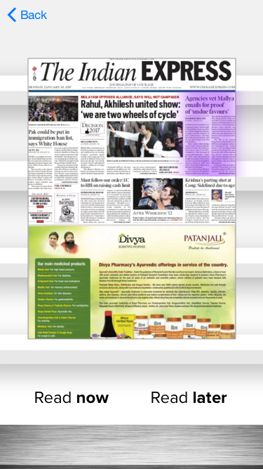 Screen 3: A major advantage of an ePaper such as this The Indian Express is that it is very familiar to readers of print news, since it is simply the newspaper in PDF form. However, such ePapers are extremely hard to navigate. The reader must pinch and pan many times until a story is at a reasonable size to read. This app, instead, has clickable areas representing stories. When clicked, a far more readable version is pulled up.