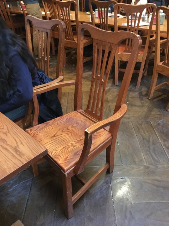 Wooden dining hall chairs with bowed-out armrests at Harvard's Adams House that are attractive but poorly suited to the tightly packed dining hall layout, making them difficult to get in and out of.