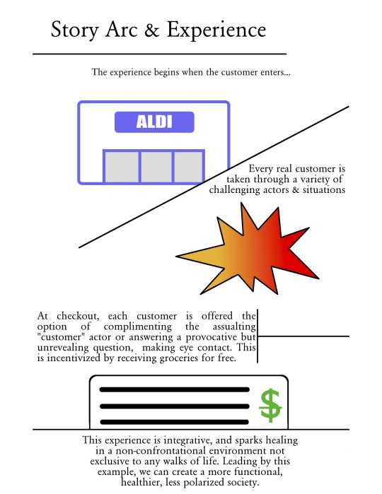 When designing the poster to advertise my experience, I purposely used graphic design techniques from other supermarket ads I found, incorporating busyness and an emphasis on communicating through fonts and prices. My color palette was also intentional, using colors found in the Aldi logo, as well as green to represent a pride in Wisconsin. And of course, “Ham it up” is a pun, as supermarkets are wont to do with their sale names. Of course, all items being advertised as free is also a draw to the store. It was made in Illustrator. All in all, the poster is intentional in its gaudiness, as this means that this theatrical spectacle blends in with the environment of other supermarkets, eliminating potential for self-selection bias, and maintaining a general familiar, non-confrontational atmosphere. The storyboard is also simple and logical in its presentation, aptly summarizing the appropriate and important points of the experience. It was created in Illustrator and GIMP.