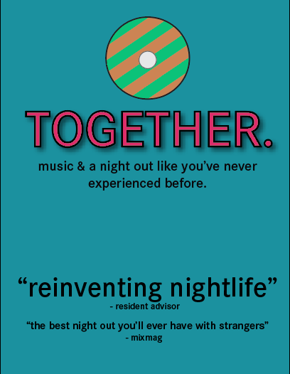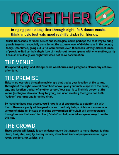 Together, a redesigned nightlife experience using electronic music events in unexpected venues with a mobile app that matches strangers for conversation, rewarding meetings with free drinks.