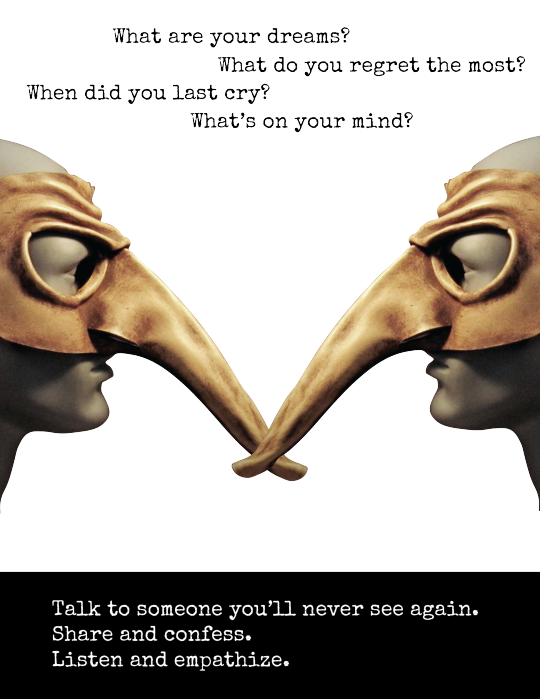 Mask and Unmask, an anonymous social experience where masked strangers meet in boardrooms at night and ask each other deeply personal questions, inspired by the video game Journey's fleeting anonymous connections.