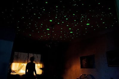Glow-in-the-dark adhesive stars for ceiling/wall decoration, using phosphorescent compounds (zinc sulfide or strontium aluminate) that slowly release absorbed light.