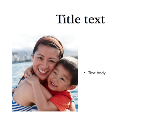 My template for presentations keeps a very minimalist slide layout, only utilizing two fonts, one serif and one sans serif to maintain continuity, yet distinguish between the two types of information.