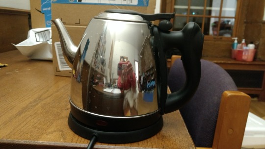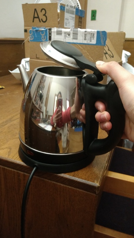 A stainless steel electric kettle on a base platform, used daily for boiling water for tea and other purposes in a college dorm setting.