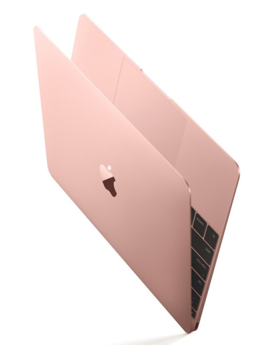 Apple MacBook in rose gold/pink, an ultra-lightweight laptop praised for its portability and redesigned two-part charger.
