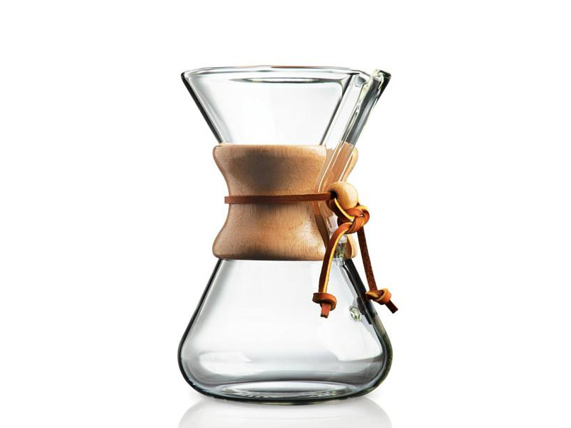 Chemex pour-over coffeemaker, an hourglass-shaped glass flask designed by Peter Schlumbohm in 1941, now in MoMA's permanent collection.