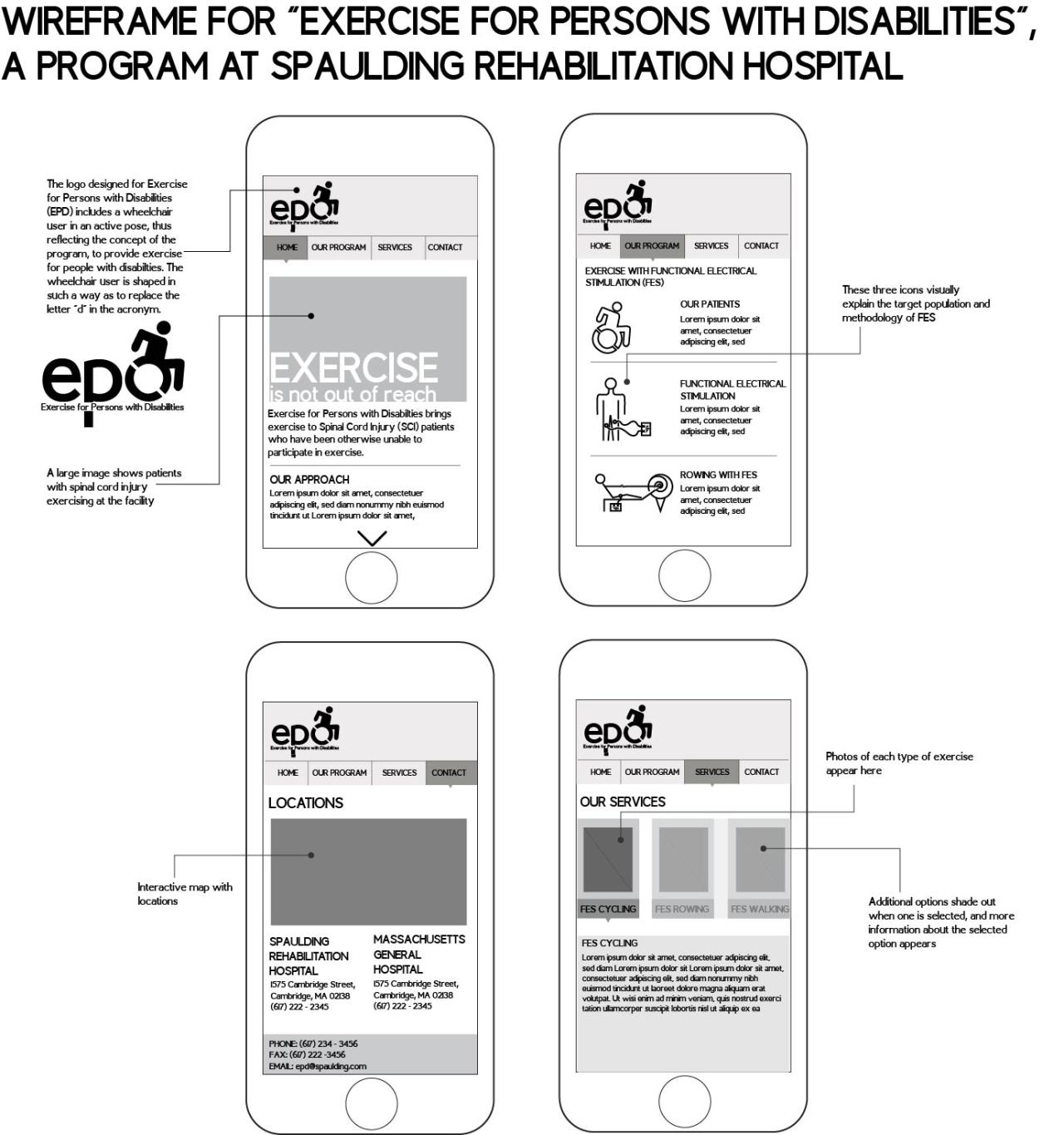 Challenge 2A comprehensive design project for Exercise for Persons with Disabilities (EPD) at Spaulding Rehab Hospital, including a wheelchair-integrated logo, functional electrical stimulation icons, and a mobile website wireframe.
