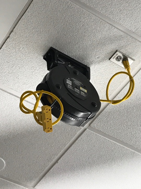Retractable ceiling-mounted power outlets in a classroom that drop down cords for students to charge laptops.