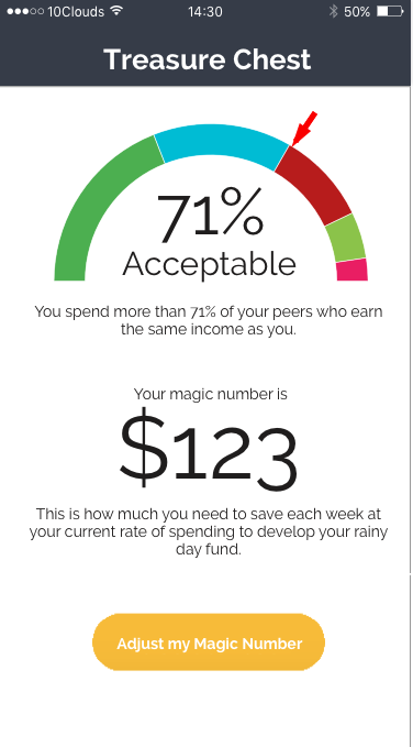 Treasure Chest, a budgeting and savings app designed for 25-35 year olds below median income to build a $5,000 emergency fund through automated weekly saving and peer spending comparisons.