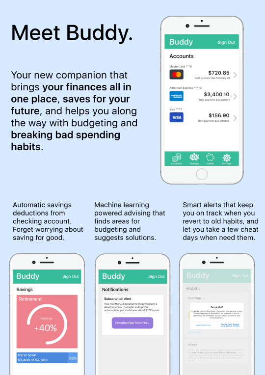 Buddy, a personal finance app for millennials that auto-deducts savings from paychecks, uses machine learning to analyze spending habits, and provides nudges to break bad financial behavior.