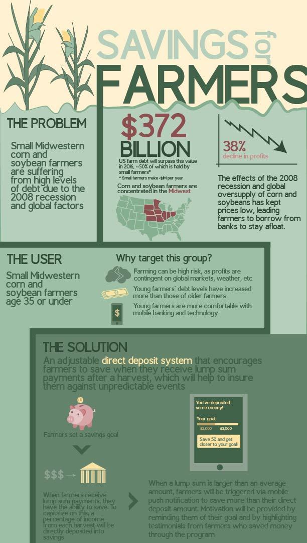 Savings for Farmers – Challenge 3Problem Statement + Target UsersAfter the recession of 2008, corn and soybean futures declined significantly, with farm profits falling by 38% in 2009, which has led farm debt to increase to its current value of $372 billion [1]. Although some farmers saw increases in profits, such as sugar farmers, farmers with cash crops like corn and soybeans who reside in what’s known as America’s farm belt did not. Demand for crops such as corn and soybeans increased significantly in the years leading up to the recession largely in part due to pressures placed by the ethanol industry [1]. In 2009, U.S. corn farmers produced a record of well over 13 billion bushels of corn in anticipation of this increase in demand [1]. In the aftermath of the recession, corn and soybean prices dropped drastically and the market was flooded. Consequently, farmland values also dropped [1].Farmers were left with no profits and often deficits, decreases in land value, and an increased need to provide for their families. The number of US farmers dropped by 4.3% from 2007 to 2012 [2]. Although this percentage seems small, it represents a significant statistical change [2]. Although farmers make up merely 2% of the American population [2], agriculture and agricultural related industries comprise nearly 6% of the GDP [3]. In order to continue operating, farmers are opting to borrow from banks in order to buy essentials like seeds and fertilizer [4]. However, if markets do not improve, increased borrowing can send farmers into more debt, creating a vicious cycle. Research by Robinson, Barry, and Burghardt has shown that farmers will continue taking on more debt in a “go for broke” manner in order to avoid liquidating fixed assets, like equipment [5]. Thus, it is imperative that farmers are given tools to encourage them to save, in order to ensure they have a safety net that will keep them from engaging in high-risk borrowing behaviors. Despite increased pressure placed on American farmers due to debt, few institutions are in place to protect farmers from sinking deeper into debt. Agriculture is a difficult industry: crop yields can be determined due to weather catastrophes and prices are largely impacted by global markets [4]. Although we can’t protect farmers from external factors such as the market or environmental factors such as droughts, we can establish institutions to help farmers save their profits during good years for a cushion for bad years that might come. We’re targeting farmers who suffered losses after the Great Recession or natural disasters in income and farmland value – particularly corn and soybean farmers. In particular, we are targeting farmers 35 and younger, since their debt levels have increased more than those of older farmers [6]. This group is an ideal target due to their comfort with technology and their receipt of income in lump sums. As younger people, they are more likely to be comfortable with technology, particularly mobile banking using computers or phones [7], presenting an opportunity to use mobile tools to help them save. Like most farmers, they receive income in lump sum payments after each harvest instead of in hourly wages, meaning that an intervention that targets them when they receive significant sums of money could have real impact on their savings. SolutionSince there are no specific savings programs that target young, Midwestern corn and soybean farmers in their thirties, we aim to create such a program. This program will be offered by local and national banks that offer loans and financial services in farming communities in the Midwest. Banks will recruit farmers within the target age range through online advertising and targeted outreach to farmers within the target demographic. The target behavior for our users is to save. In order to create a target behavior, an individual must have the motivation to perform an action, the ability to do so, and a trigger [8]. When a farmer enrolls in the program, they will be prompted to set a savings goal and a date they would like to save that amount by. To increase a farmer’s ability to to save, our program operates via direct deposit. Whenever a farmer receives a deposit, a percentage of that amount will be placed into the savings account. If a farmer receives a particularly large sum of money, the farmer will be prompted via push notification, email, or letter to save an additional percentage of it at the click of a button (or via mailing back a letter in an stamped envelope) that serves as a trigger. The motivation portion of the algorithm will be included in two ways. First, when the farmer is prompted to save, the farmer will see a graph of his or her current savings and goal amount, giving the individual a visual representation of their progress. The motivation will include spotlights or testimonials from local farmers who saved a certain percentage of their income and were able to get out or debt or make an improvement to their business. Thus, the plan motivates farmers through extrinsic motivation (reaching a goal) and also reinforces behavior by using peer influence. Our program also profits banks – the savings program increases bank funds thereby allowing the bank to make more money off of loans.Citations[1]http://search.proquest.com.ezp-prod1.hul.harvard.edu/docview/399137013?rfr_id=info%3Axri%2Fsid%3Aprimo [2]https://www.agcensus.usda.gov/Publications/2012/Online_Resources/Highlights/Farm_Demographics/ [3]https://www.ers.usda.gov/data-products/ag-and-food-statistics-charting-the-essentials/ag-and-food-sectors-and-the-economy.aspx[4] http://www.npr.org/sections/thesalt/2016/03/03/468887506/with-economy-stuck-in-the-mud-farmers-sink-deeper-into-debt[5] http://www.jstor.org.ezp-prod1.hul.harvard.edu/stable/pdf/1242712.pdf [6] https://www.kansascityfed.org/publicat/mse/mse_0610.pdf[7] https://www.federalreserve.gov/econresdata/consumers-and-mobile-financial-services-report-201603