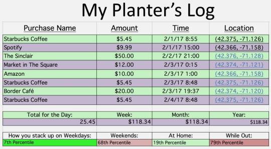 In our Shadow World layer, you can see visually how your savings stack up to those of your peers, in both quantity and location. In the Planter’s Log, you can see the nuts and bolts of when, where, and how much you spend and save.