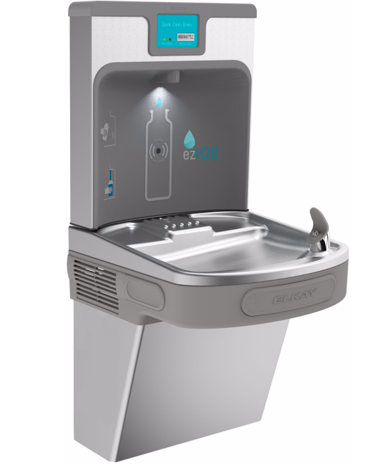 Elkay ezH20 water fountain with integrated bottle filling station, digital counter showing plastic bottles saved, and high-tech water filters.