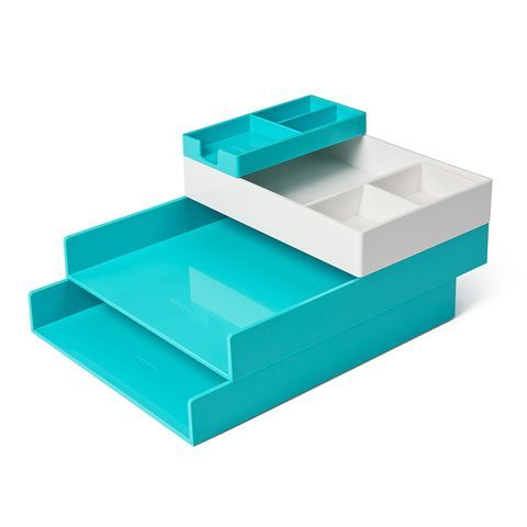 Poppin desk accessories, a colorful and stackable office supply set made of hard plastic in a coordinated color palette.