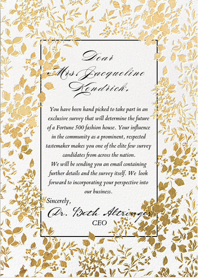 Step 2: Mail the target women an embossed, wax sealed card (see above) inviting them to take the survey. We actually found a card designed by Oscar de la Renta on Paperless Post that conveys a sense of exclusivity, gravity, and high fashion that we believe will be taken seriously by these women. The actual text of the letter (see below) markets the study as an exclusive invite that asks the women to consult as a fashion expert for the company. This appeals to their vanity and sense of self importance, which ideally will bolster survey response rate.