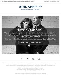 For Pinterest, our survey would look something like the above from John Smedley that links directly into the survey. They have a large following, and we would want to capitalize on the following to get higher respondents.