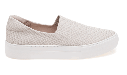 J/Slides laceless slip-on sneakers with extensive heel padding, gel inserts, and a brandless minimalist aesthetic with a subtle platform.
