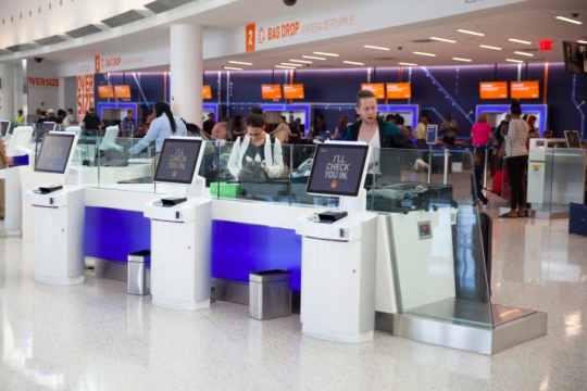 check-in kiosks are slick computers (unlike the bigger, more clunky kiosk