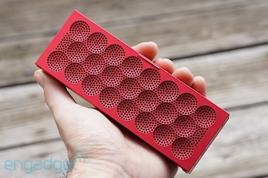 Jawbone Mini Jambox, a compact portable Bluetooth speaker with solid aluminum construction, geometric speaker patterns, and long-lasting battery in multiple color options.