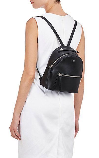 Compact black leather mini backpack used for travel, small enough to carry only essentials like a passport.