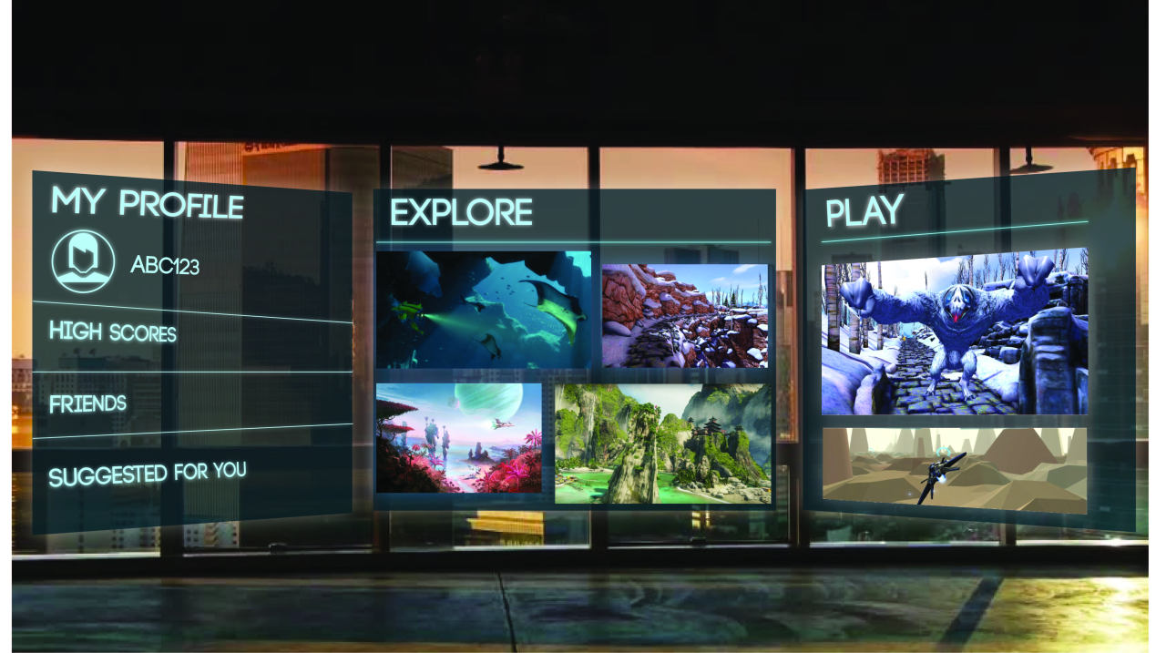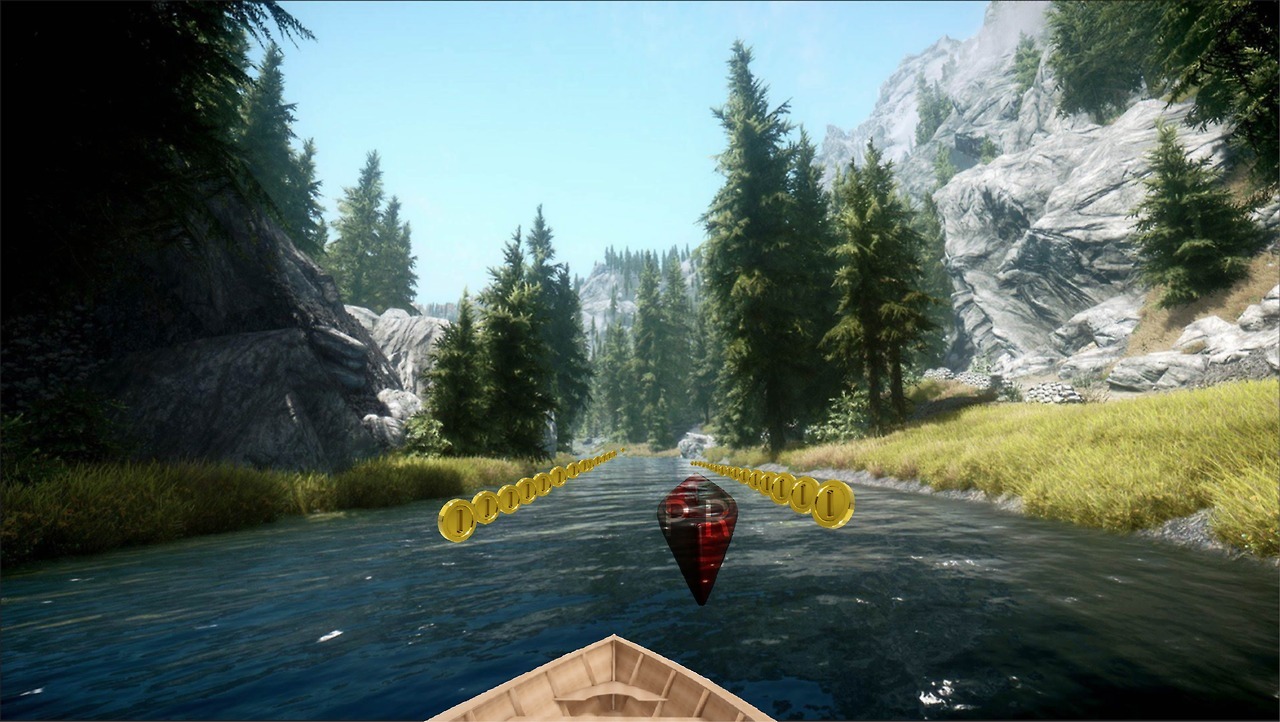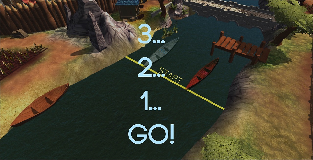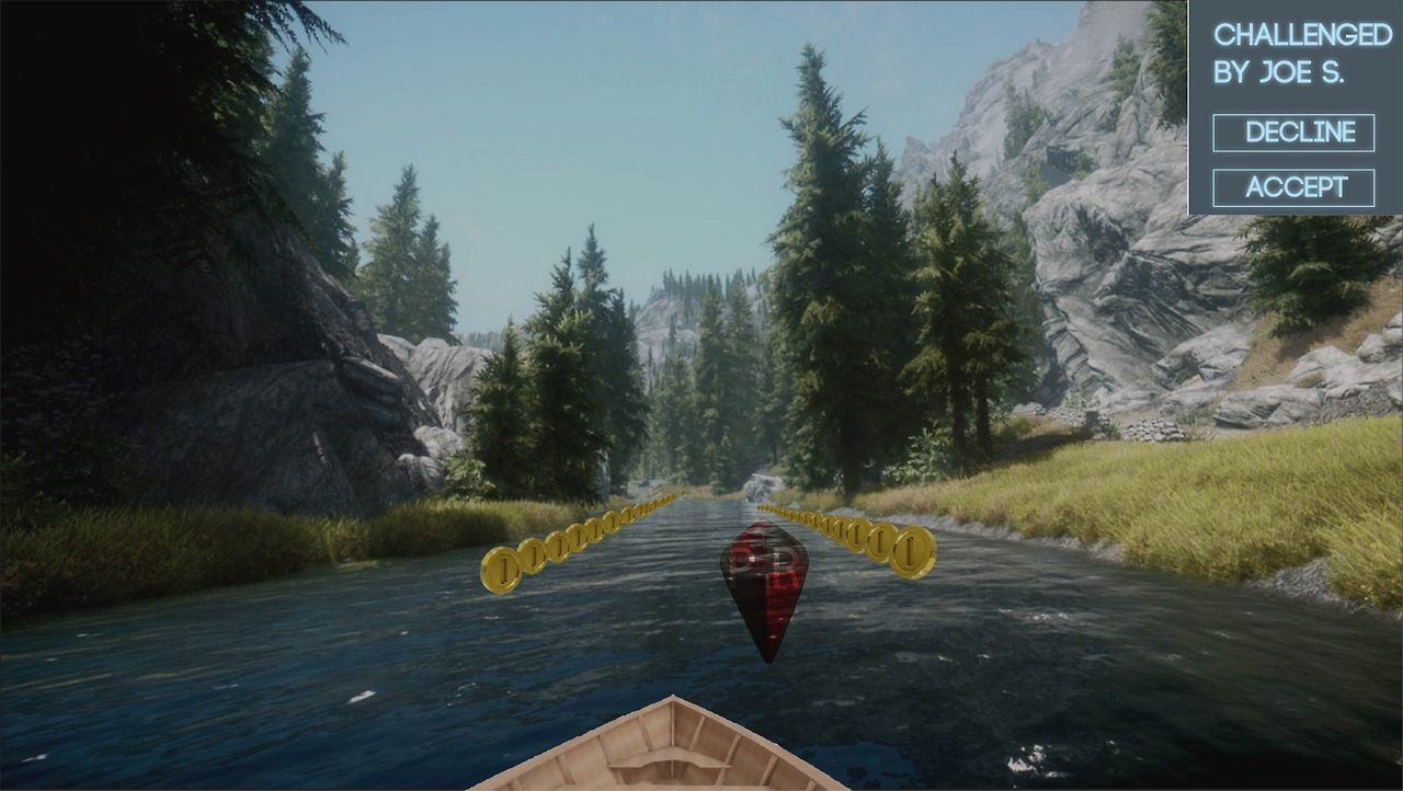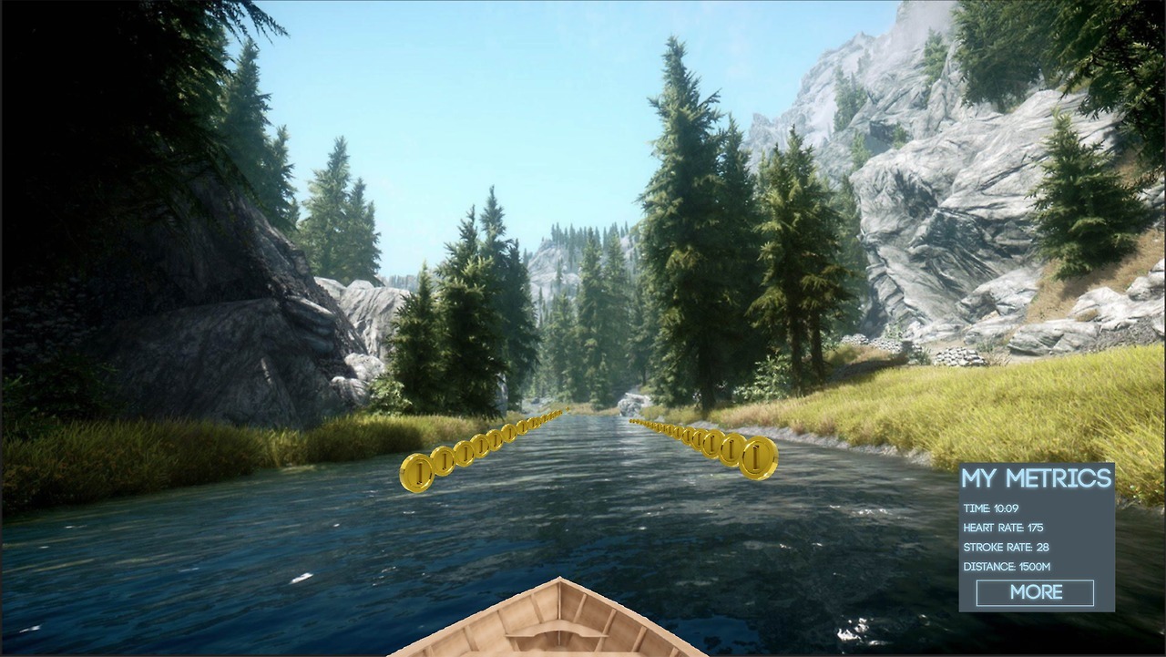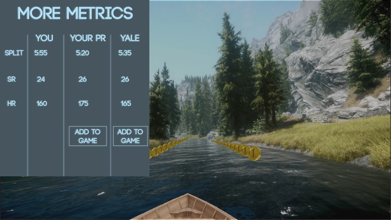 The screens we have presented here give a walkthrough of using a gamified VR experience. The first screen is the home screen of the game, after which we show scenes from an actual game. The participant rows through the world we have created, collecting coins along the way. As they row, they are able to access various metrics and compare them to their own PR and that of a competitor. We also show the social component of the game, since a friend challenges the participant part way through the game. After the participant accepts the challenge, the game resets, and the two race against each other, and our original participant wins.