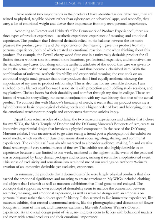 A student's design point of view essay (Challenge #8) by Annie Wu, articulating a philosophy centered on physical products with emotional significance, aesthetic-meaning balance, and immersive museum experiences.