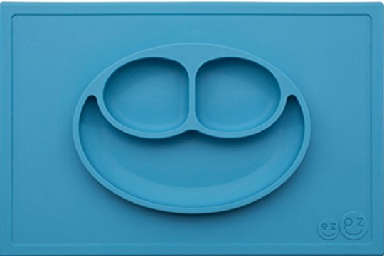 The ez-pz Happy Mat, a silicone placemat with built-in segmented plate shaped like a smiley face, designed to prevent toddlers from tipping plates.