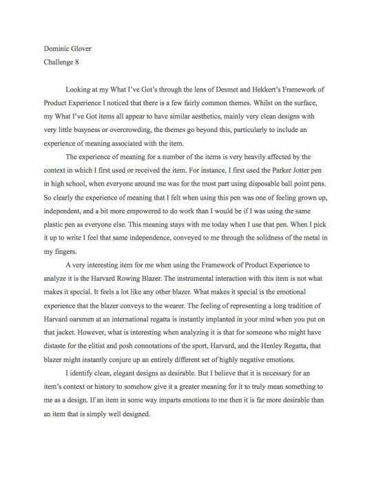 Challenge 8 design point of view essay by Dominic Glover about clean/elegant design, experience of meaning, and how personal context transforms functional items into emotionally significant ones.