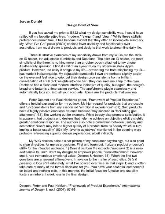 A student's design point of view essay discussing stick-on ID holders, adjustable dumbbells, and Dashlane password manager — emphasizing usability, aesthetics, and streamlined functionality.