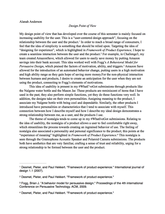 Student's Design POV essay on user-centered design, usability, nostalgia, and the relationship between user identity and product personality.