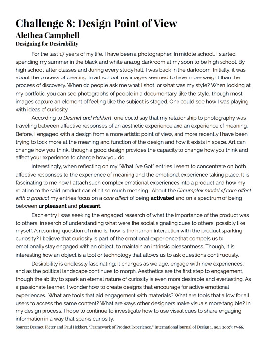 Student essay (Alethea Campbell) reflecting on her design point of view: photography as a medium for curiosity, emotional product experiences, and the role of aesthetics in sparking discovery.