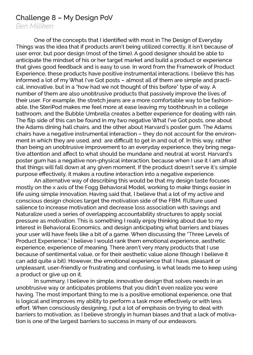 Student essay (Ben Milliken) reflecting on his design taste: preference for simple, innovative, unobtrusive designs that solve needs users didn't know they had, emphasis on Fogg Behavioral Model and emotional product experience.