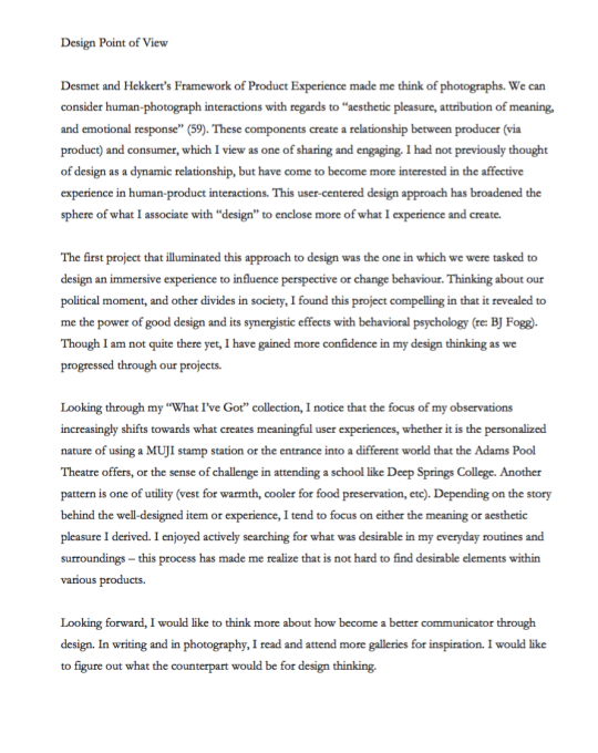 Student essay (swu) reflecting on design POV: Desmet & Hekkert's framework applied to photography and meaningful user experiences, interest in becoming a better communicator through design, drawn to MUJI and meaningful spaces.