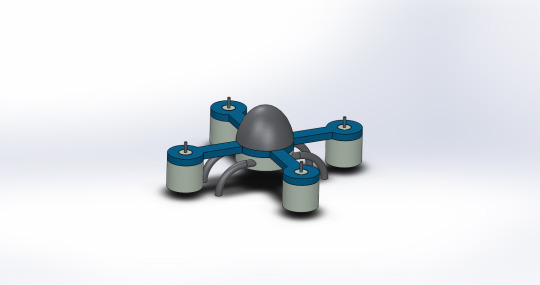 A 3D CAD-rendered quadcopter drone design with four motors and a central dome body, likely a student design project.