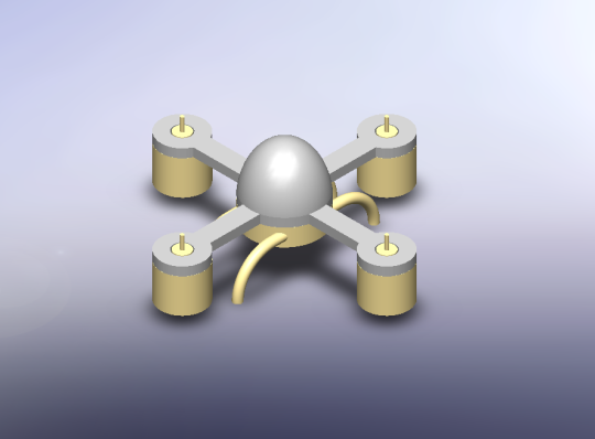 3D CAD-rendered quadcopter drone model with central dome body and four motor pods, a student design project.